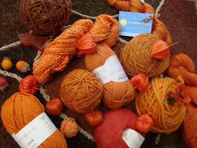 Maybe you know all of this but I sure didn't. The reason I haven't heard much about persimmons is because they are very uncommon in American gardens. I am just not familiar with this fruit but I love the color. Anyway, thought you might find that as interesting as I did. You know about my thing for all things orange. I started gathering up my favorite orange yarns in my studio this morning and you know, I have quite a collection going. Here are some of my favorite orange yarns.