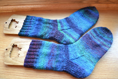 (photo ~ my handspun fingering weight yarn from Dyeabolical superwash wool roving, sock blockers from The Loopy Ewe)